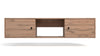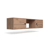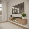 Introducing the BAM! Drakensberg TV Stand - Tunari, a floating entertainment solution inspired by South Africa's majestic Drakensberg Mountain range. This sleek plasma stand features two doors with matte black metal handles, behind which you'll find concealed shelves ideal for storing media devices, accessories, or dรฉcor.